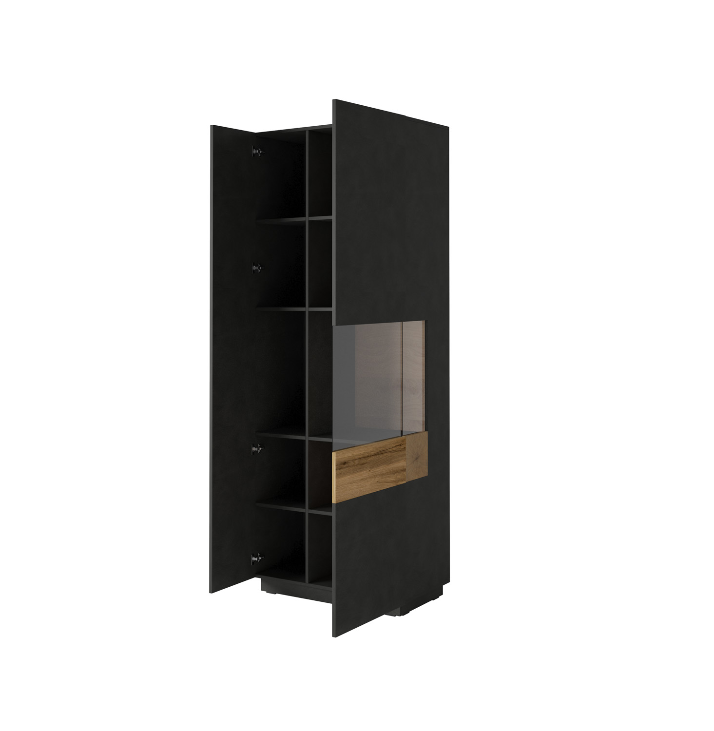 Modern Stacey vitrin polcokkal. Az ajtó egy része üvegezett, ami LED világítással tehető szebbé. A Stacey bútorok rengeteg tárolóhelyet kínálnak a bennük található polcoknak köszönhetően.
