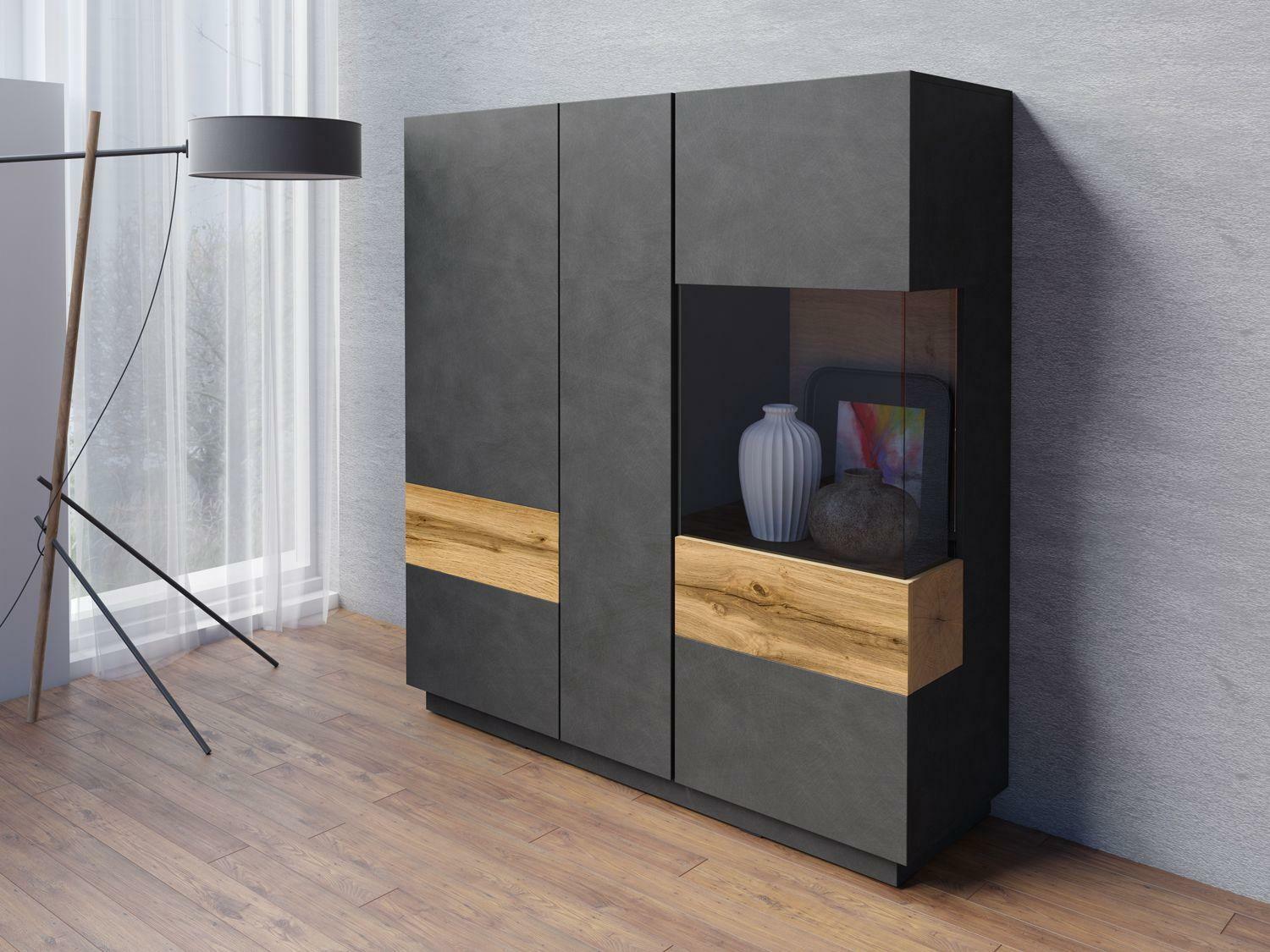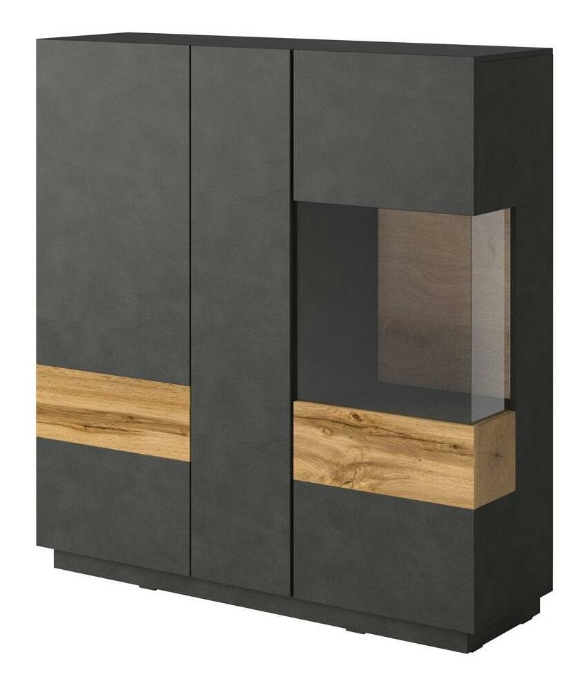 Vitrin Stacey. A termék üvegajtókkal van felszerelve. A polcok megfelelő mennyiségű tárolóhelyet kínálnak az Ön dolgai számára. Az üveges részt LED világítással teheti szebbé.