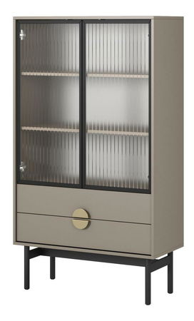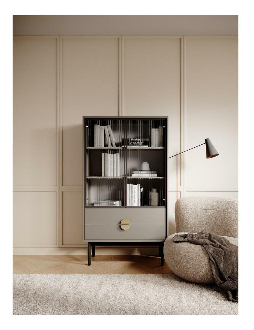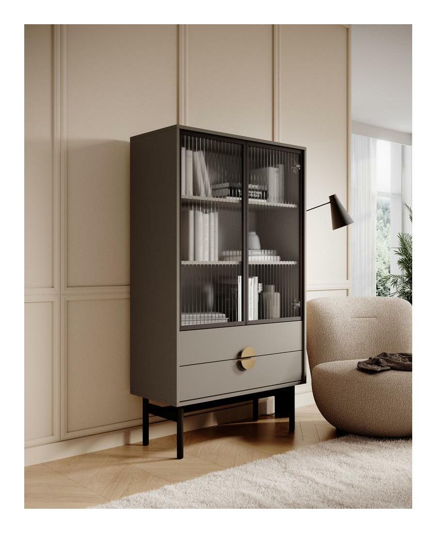 MutasdSzeretné átalakítani otthonát? Kollekciónk harmóniát és eleganciát hoz otthonába. Az elegáns, egyedi dizájnnal rendelkező vitrin tökéletesen illik modern belső terekhez. Kiváló minőségű laminált forgácslapból készült, tartós használatot biztosít. A fekete acélváza ipari stílust ad, míg az arany kör alakú fogantyúk eleganciát és finom fényt kölcsönöznek, luxus érzetet teremtve. A vitrin funkcionális tervezéssel készült, rendelkezik fiókokkal kisebb tárgyak számára és egy zárt polcos résszel dekorációknak, családi emlékeknek vagy mini könyvtárnak. Az elülső csíkozott üveg dekoratív kialakítása könnyedséget és eleganciát ad az összképnek. A szokatlan szín, fekete keret és arany fogantyúk harmonikus, modern megjelenést kölcsönöznek, amely tökéletesen illik különböző belső terekhez, és egyedi karaktert ad nekik. Ez a bútor praktikus tárolási megoldás és dizájn elem is, amely kiemeli a helyiség stílusát. Termék részletei: Korpusz és ajtók Stone Grey U727 ST9 laminált lapból, amely nedvesség- és hőálló, valamint karcálló. Fekete porszórt acél keret, amely megkönnyíti a takarítást a bútor alatt. Fiókok 'push to open' rendszerrel nyithatók, polc méretei: magasság 28,5 cm x mélység 37 cm, arany színű fogantyúk rozsdamentes acélból.