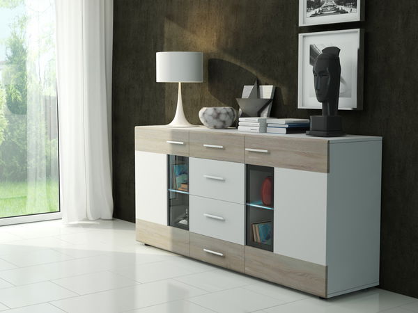 Vitrin szekrény Talitha (fehér + sonoma tölgy) (világítás nélkül)